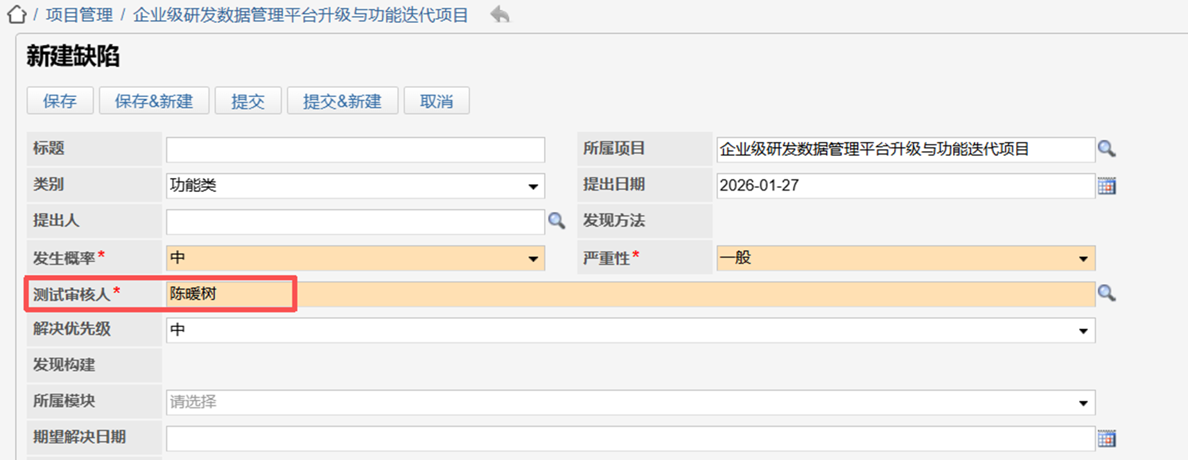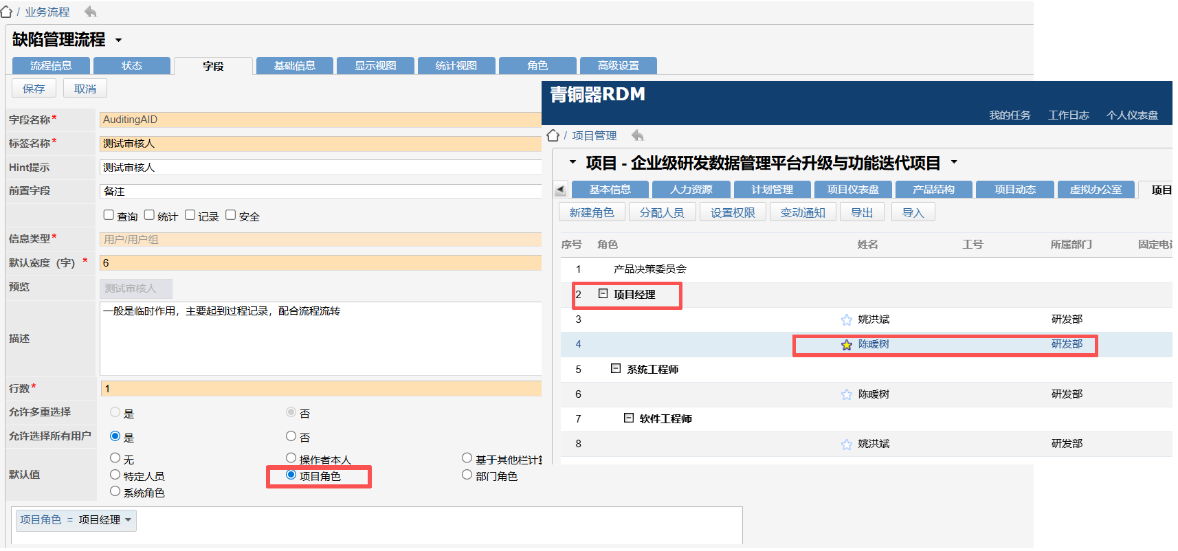优化用户字段单选场景下的默认值匹配逻辑:当匹配的项目角色或部门角色下存在多名用户时,系统将优先选取该角色已预设的缺省用户作为默认值,确保单选场景中默认值的唯一性与合理性,避免用户重复筛选。